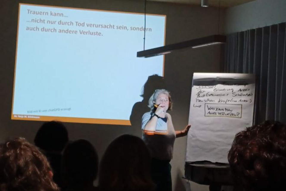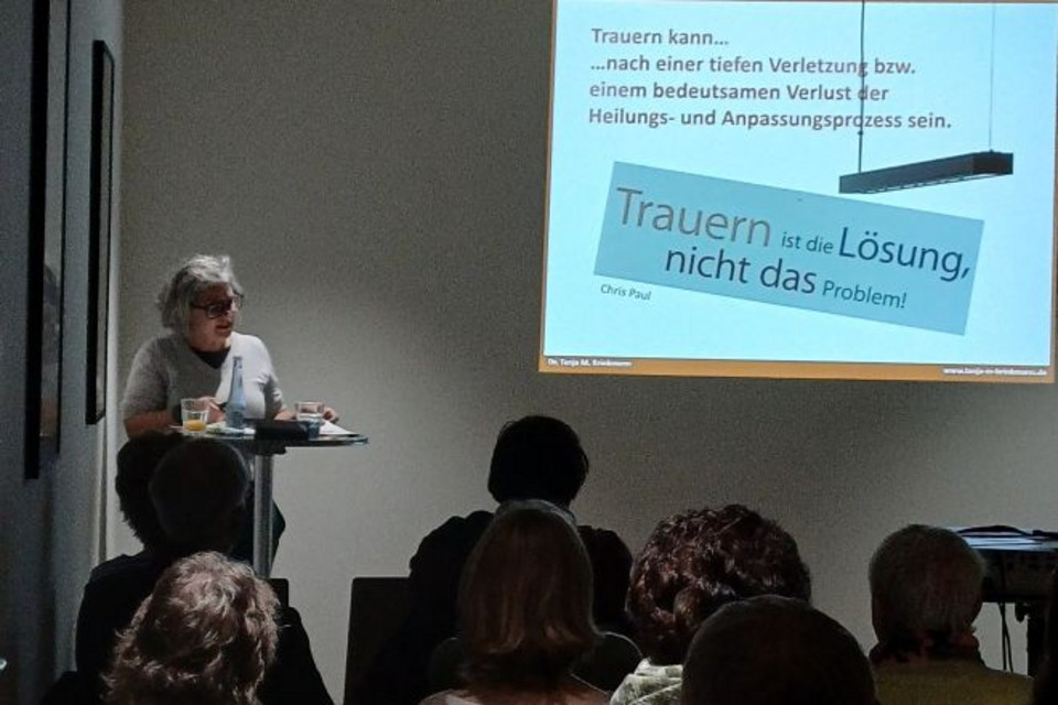 Die Referentin Dr. Tanja M. Brinkmann, Trauerberaterin, promovierte Soziologin, Sozialpädagogin und Krankenschwester, stellte gleich zu Beginn eine zentrale Perspektive in den Mittelpunkt: Nicht die Trauer ist das Problem, sondern der Verlust – und Trauern ist der Weg, Verluste in das eigene Leben zu integrieren. In ihrem Vortrag machte sie deutlich, dass Trauer viele Ursachen haben kann und weit über den Tod eines Menschen hinausgeht. Auch Abschiede, Veränderungen oder Brüche im Leben können Trauer auslösen